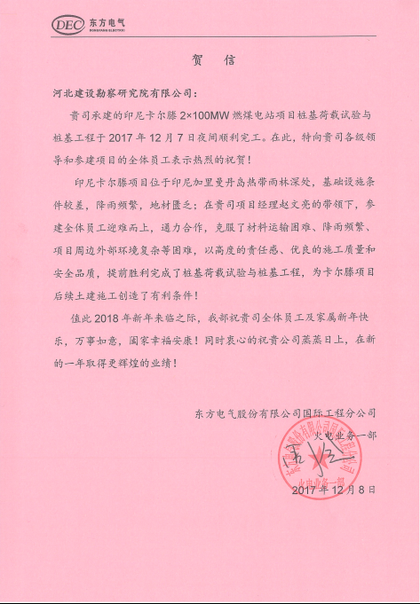 我公司承建的印尼卡爾滕2*100MW燃煤電站項目樁基荷載試驗與樁基工程于2017年12月7日夜間順利完工。東方電氣股份有限公司國際工程分公司發(fā)來賀信,向我公司項目員工表示祝賀。