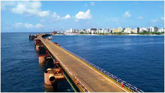 中馬友誼大橋位于馬爾代夫北馬累環(huán)礁(North Malé Atoll),跨越Gaadhoo Koa海峽,連接環(huán)礁上馬累島、機場島(瑚湖爾島)兩個相鄰島嶼,是馬爾代夫重要的島嶼連接線工程。項目起點位于馬累島東南角,順接規(guī)劃Boduthakurufaanu Magu道路,隨后設(shè)置橋梁跨越Gaadhoo Koa 海峽,在機場島南段登陸,大橋接線與機場到Hulhumale 規(guī)劃路順接,全橋長度2km,雙向四車道,由橋梁、引堤、道路等工程組成,主橋為主跨180m混合疊合梁連續(xù)鋼構(gòu)橋,引橋為蓋梁混凝土預(yù)制梁橋。項目采用中國公路工程規(guī)范標(biāo)準(zhǔn),設(shè)計使用壽命100年。