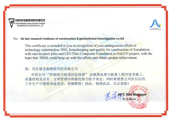我公司承建的伊朗南方鋁項(xiàng)目,自開(kāi)工以來(lái)精心策劃、有效組織、認(rèn)真施工、積極與業(yè)主配合,保質(zhì)保量完成了施工進(jìn)度。在施工過(guò)程中業(yè)主對(duì)我公司伊朗南方鋁項(xiàng)目部在技術(shù)施工、質(zhì)量控制及安全、文明管理中所做的努力給予了肯定,并授予表彰證書(shū)。