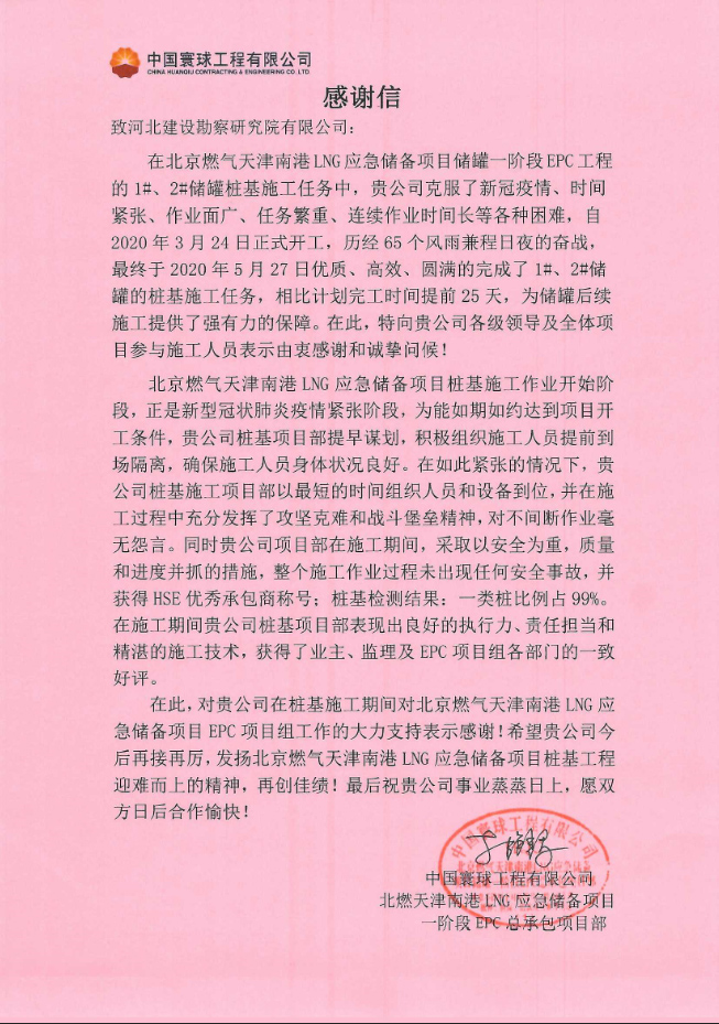 由我公司承建的北京燃氣天津南港LNG應急儲備項目1#、2#儲罐樁基工程,自2020年3月24日正式開工,歷經65個日夜的奮戰(zhàn),最終于2020年5月27日優(yōu)質、高效、圓滿的完成了1#、2#儲罐的樁基施工任務。中國寰球工程有限公司北京燃氣天津南港LNG應急儲備項目儲罐一階段EPC項目組,對我公司北燃樁基項目組表示由衷的感謝,感謝我公司領導及全體項目施工人員的辛勤付出,在克服了新冠疫情、時間緊張、作業(yè)面廣、任務繁重、連續(xù)作業(yè)時間長等各種困難的情況下,奮勇向前,較原定工期提前25天完成施工任務,為項目后續(xù)施工帶來了強有力的工期保障。同時對我公司在樁基施工期間對北京燃氣天津南港LNG應急儲備項目EPC項目組工作的大力支持表示感謝!希望我公司今后再接再厲,繼續(xù)發(fā)揚迎難而上的精神,再創(chuàng)佳績!